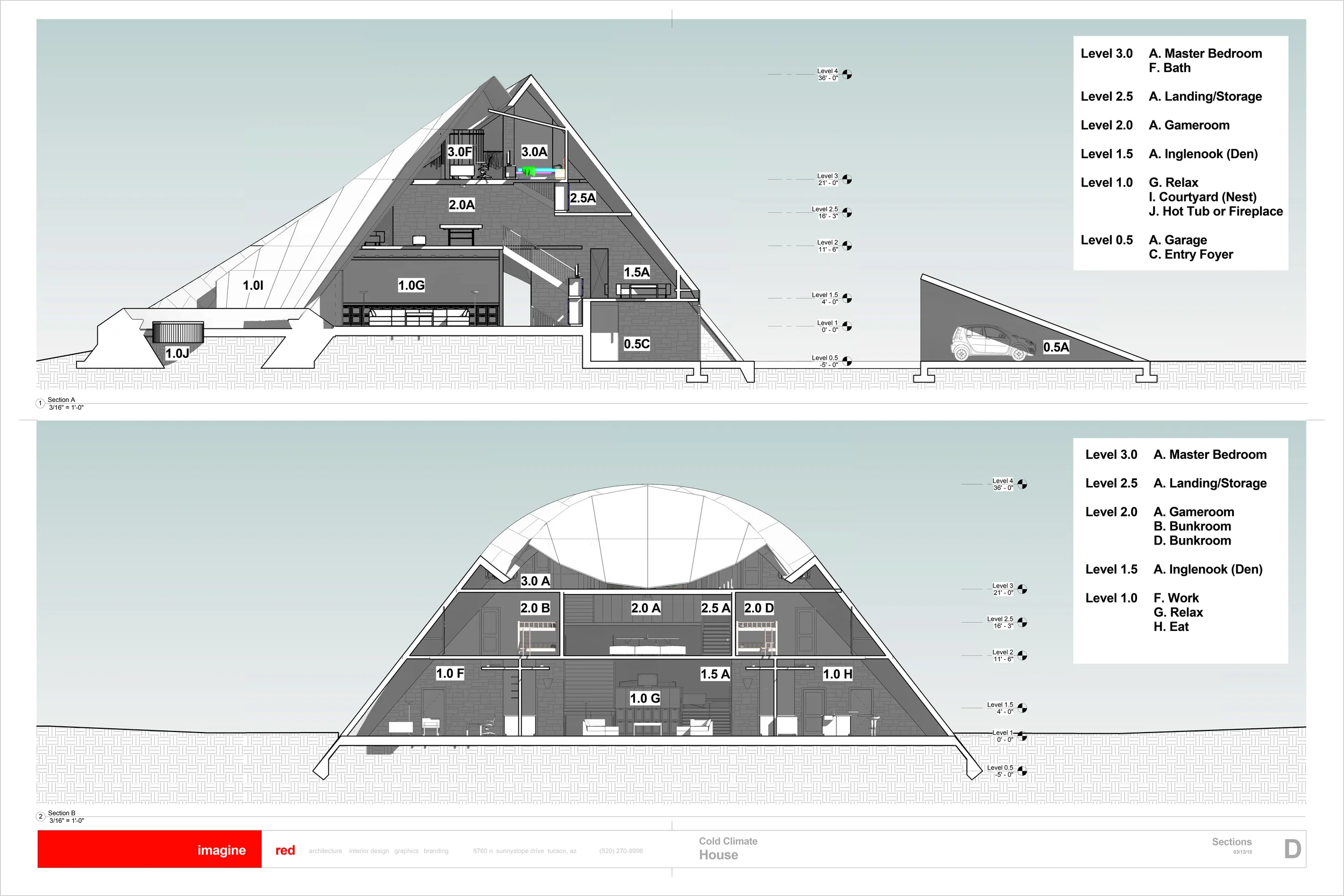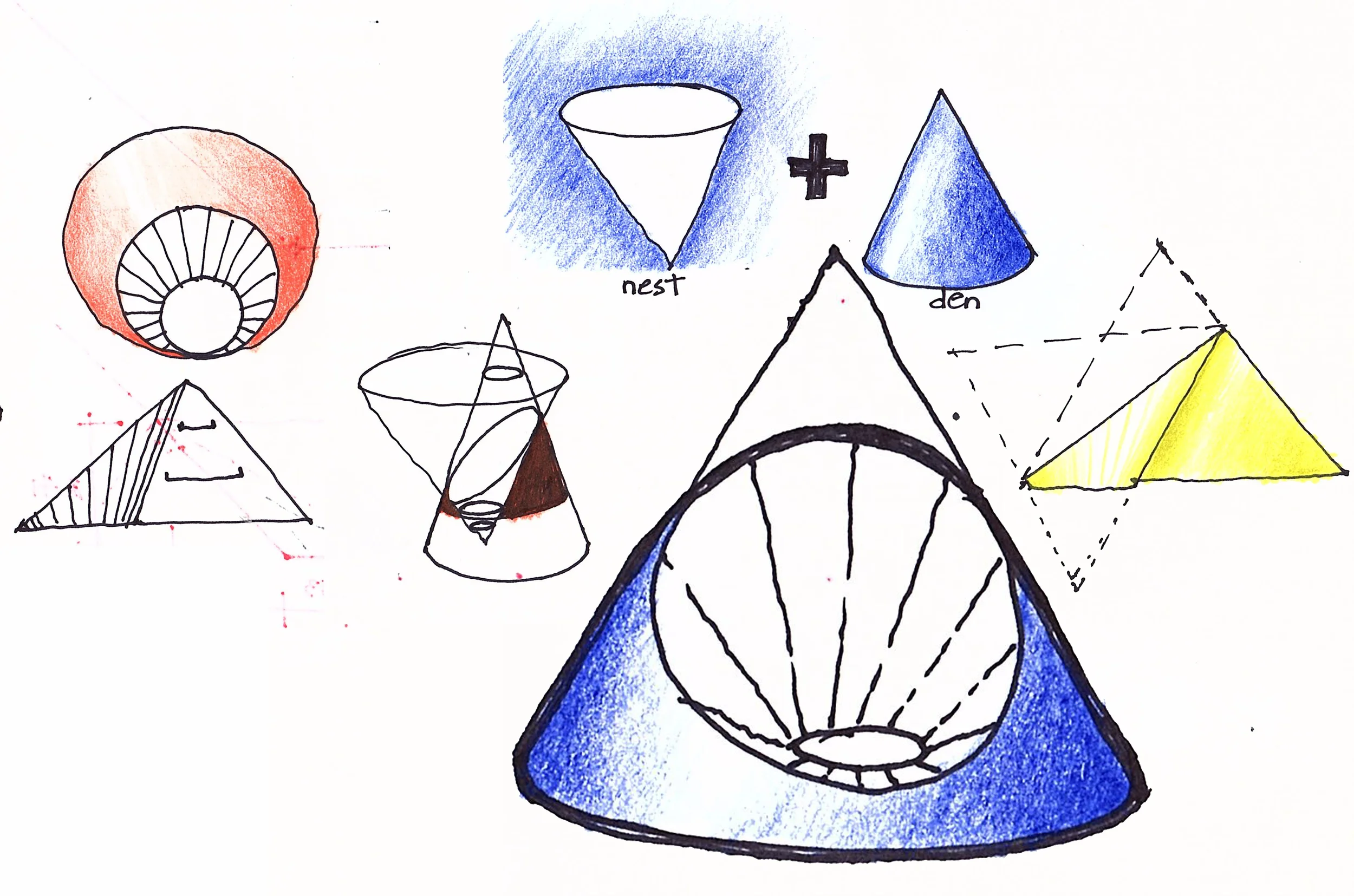 A house offering bear den and bird nest, learning from igloo and "A" frame, celebrating fire while living in ice: this is what we set out to imagine. Den and Nest, Igloo and "A" frame, all got thrown in the soup pot, and out onto our sketchbook came 2 cones superimposed: nest carved out of den, the resulting section an "A" frame curved into a croissant. If that sounds abrupt, we will admit to a few ugly sketches in advance of these ugly sketches, and also a growing sense that simply stacking rectangles can't be the only sensible answer to most design problems, and also some curiosity about the problems that would ensue from heading down this path.
